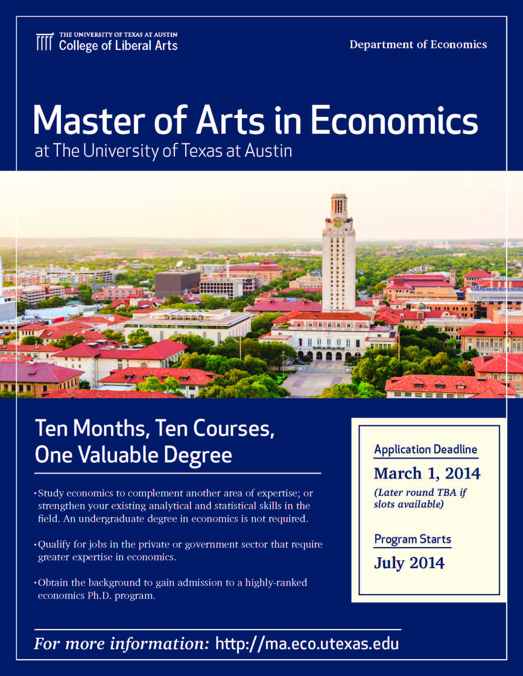 Masters in Economics at UT-Austin (10 month program) Application Deadline 03/01/14 ImageJanuary 9, 2014ucsbecon Share this: Share on Facebook (Opens in new window) Facebook Like Loading... Related