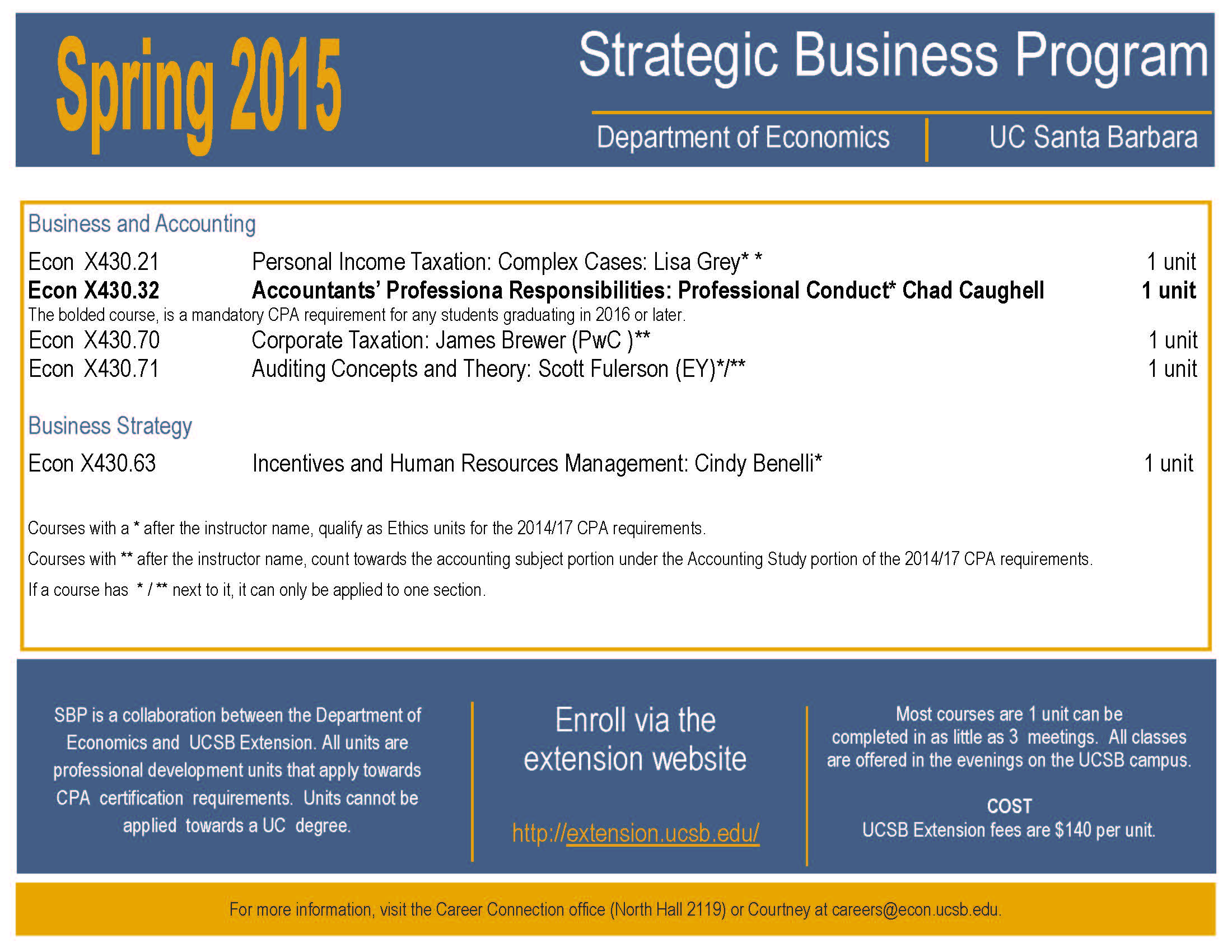 We have some great SBP classes scheduled for the spring! PwC and EY firm professionals are scheduled to teach very unique course. this is a great opportunity to do some networking prior to Fall recruitment.