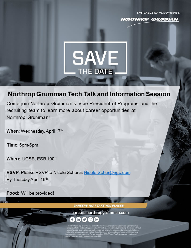 Come join Northrop Grumman’s Leadership and Recruiters to learn more about future full time career opportunities and internship opportunities. Our Vice President of Programs will be attending to share more about his career path. We will answer questions on our application process, what our hiring managers look for, and how to prepare for your career. We look forward to seeing you there! You will also be able to apply directly with the recruiters by attending this event – bring your resumes!