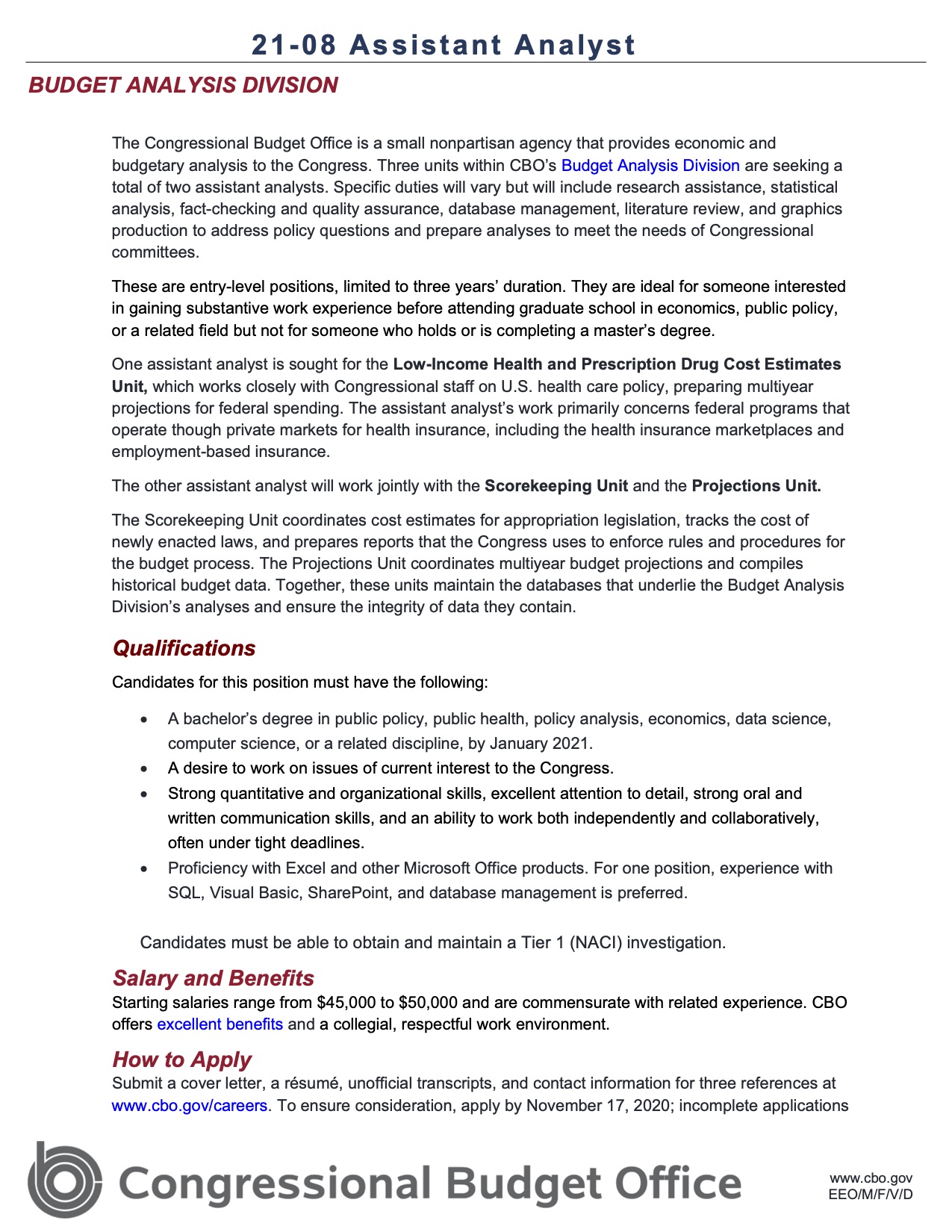 The Congressional Budget Office is a small nonpartisan agency that provides economic and budgetary analysis to the Congress. Three units within CBO’s Budget Analysis Division are seeking a total of two assistant analysts. Specific duties will vary but will include research assistance, statistical analysis, fact-checking and quality assurance, database management, literature review, and graphics production to address policy questions and prepare analyses to meet the needs of Congressional committees.