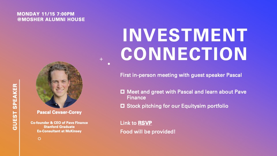 Monday 11/15 @7pm Investment Connection will be hosting its first in-person meeting with guest speaker Pascal Cevaer-Corey. Pascal is the co-founder and CEO of Pave Finance, a new startup that aims to promote equality by empowering everyone to reimagine their financial future. He is an ex-consultant at McKinsey and graduated from Stanford in 2018.