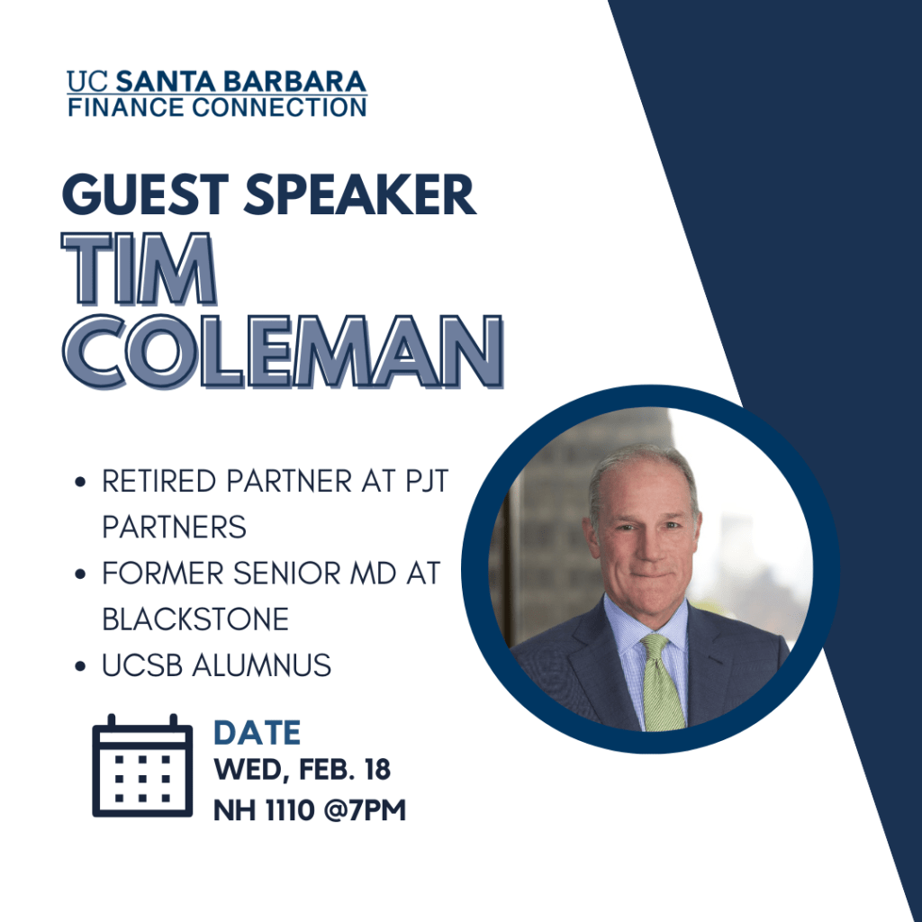 This Wednesday, February 18th, at 7PM in North Hall 1110 we will be hosting guest speaker Tim Coleman in-person. Tim was a senior MD at Blackstone and partner at PJT Partners, where he served as the Global Head of Restructuring Investment Banking. Tim notably played key roles the restructurings of Bear Stearns, Macy’s Inc., Delta Airlines, Ford Motor Company, Purdue Pharma (maker of Oxycontin), and the Los Angeles Dodgers. Tim is also known as one of the original bankers who turned debt restructuring into a major moneymaker for Wall Street.