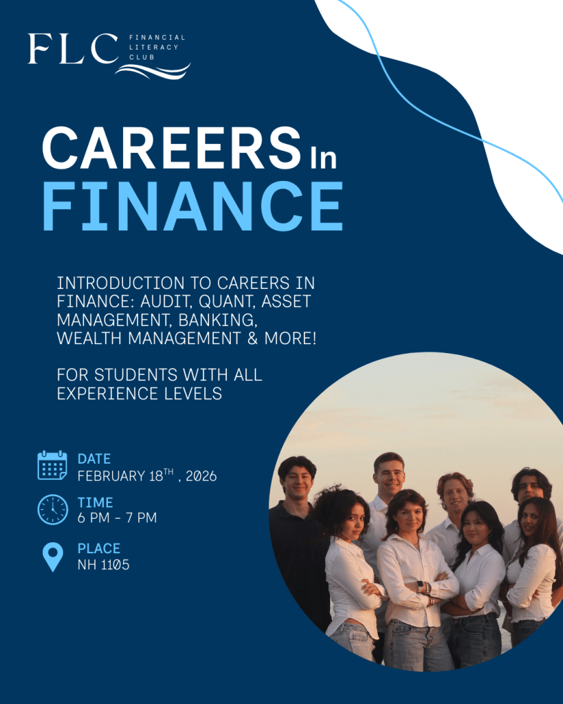 We’re hosting a Careers in Finance: Introduction to Audit, Quant, Asset Management, Banking, Wealth Management & More info session on February 18, 2026 from 6:00–7:00 PM in NH 1105 .
